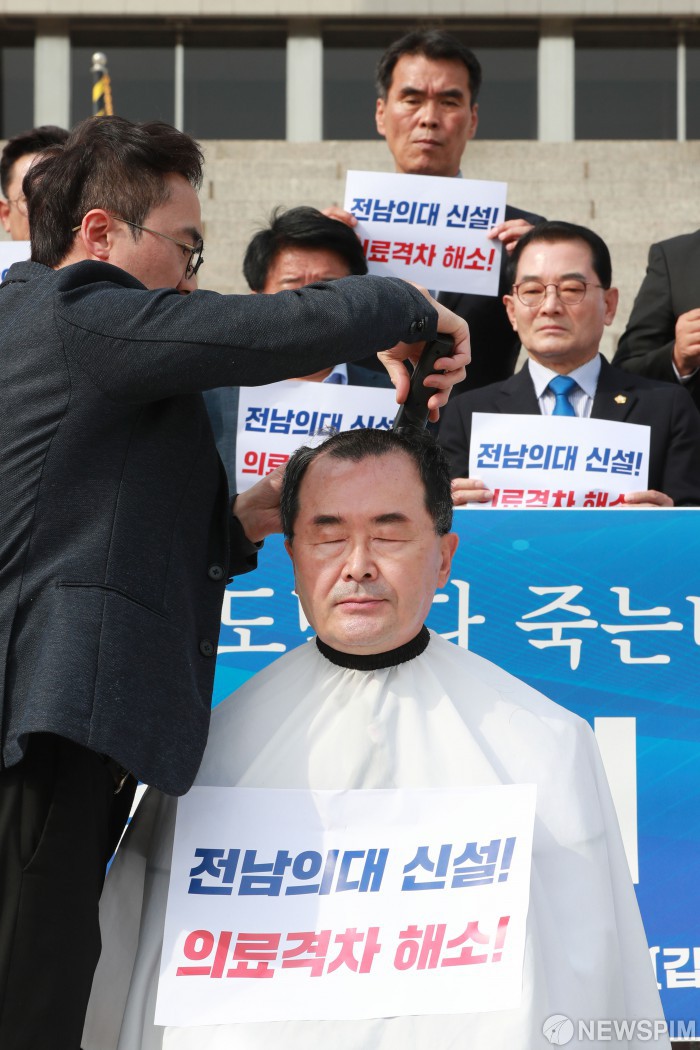[서울=뉴스핌] 이형석 기자 = 소병철 더불어민주당 의원이 18일 오후 서울 여의도 국회에서 전라남도 의대 신설을 촉구하며 삭발을 하고 있다. 2023.10.18 leehs@newspim.com
