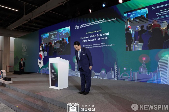 [서울=뉴스핌] 윤석열 대통령이 23일(현지시간) 리야드 네옴 전시관에서 열린 한-사우디 건설협력 50주년 기념식에서 참석자들에게 인사하고 있다. [사진=대통령실] 2023.10.24 photo@newspim.com