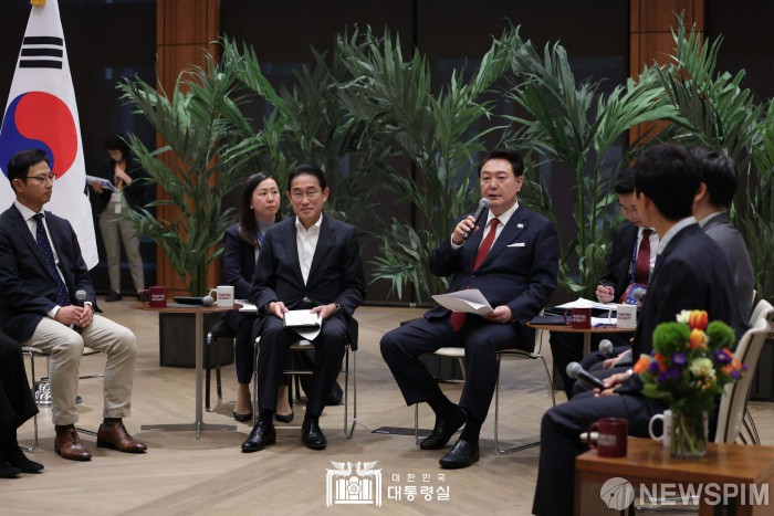 [서울=뉴스핌] 윤석열 대통령이 17일(현지시간) 미국 캘리포니아주 스탠퍼드대 후버연구소에서 열린 한일 스타트업 간담회에서 발언하고 있다. 왼쪽은 기시다 후미오 일본 총리. [사진=대통령실] 2023.11.18 photo@newspim.com