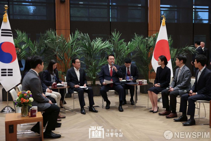 [서울=뉴스핌] 윤석열 대통령이 17일(현지시간) 미국 캘리포니아주 스탠퍼드대 후버연구소에서 열린 한일 스타트업 간담회에서 발언하고 있다. 왼쪽은 기시다 후미오 일본 총리. [사진=대통령실] 2023.11.18 photo@newspim.com