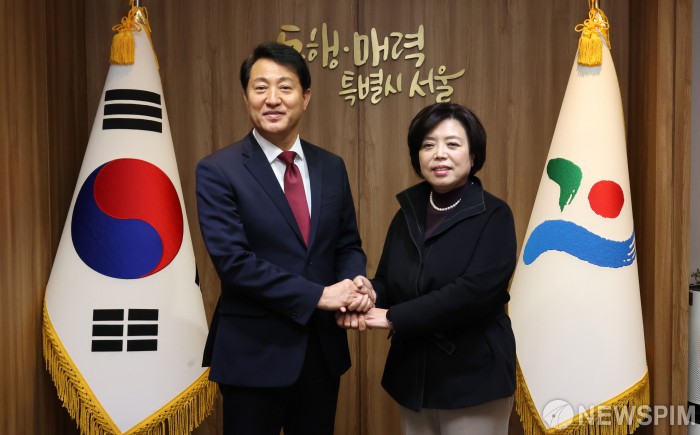 [서울=뉴스핌] 양윤모 기자 = 오세훈 서울시장이 29일 오전 서울시청에서 신계용 과천시장을 만나 과천을 서울에 편입하는 방안인 메가시티 정책을 논의전 손잡고 기념촬영을 하고 있다. 오세훈 서울시장은 최근 김포, 구리 등 서울 인근의 지자체장을 잇따라 만나 수도권 메가시티에 대해 서로 의견을 나누고 있다. 2023.11.29 yym58@newspim.com