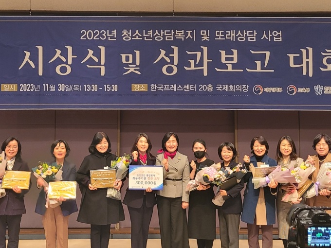 | 박숙이 경남 밀양시 청소년상담복지센터장(왼쪽 세번째)이 30일 서울 중구 한국프레스센터 국제회의장에 열린 2023년 청소년 상담복지 및 또래상담 사업 성과보고 대회에서 2023년 종합평가 최우수센터로 선정돼 여성가족부 장관상을 수상한 뒤 기뻐하고 있다.[사진=밀양시] 2023.11.30. |