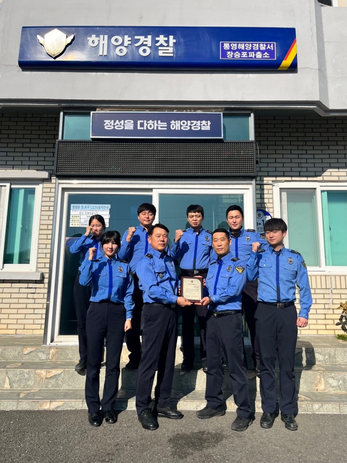 | 남해지방해양경찰청이 주관한 함정・파출소 평가에서 최우수 파출소로 선정된 장승포파출소 직원들이 기념사진을 찍고 있다.[사진=통영해양경찰서] 2023.12.05. |
