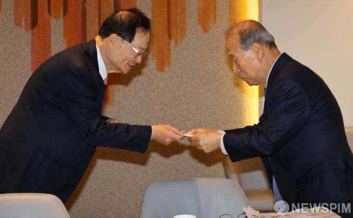 [서울=뉴스핌] 양윤모 기자 = 이복현 금융감독원장과 은행지주 이사회 의장 간담회가 12일 오전 서울 중구 은행연합회 뱅커스클럽에서 비공개로 개최된 가운데 최경수 BNK금융지주 이사회 의장(왼쪽)과 최용호 DGB금융지주 이사회 의장이 명함을 교환하고 있다. 이자리에는 김경호 KB금융지주 이사회 의장,이윤재 신한금융지주 이사회 의장 ,김홍진 하나금융지주 이사회 의장,정찬형 우리금융지주 이사회 의장,이종백 NH금융지주 이사회 의장,최경수 BNK금융지주 이사회 의장,최용호 DGB금융지주 이사회 의장,유관우 JB금융지주 이사회 의장이 참석한 가운데 금융감독원의 은행지주·은행의 지배구조에 관한 모범관행 주문을 경청했다. 2023.12.12yym58@newspim.com