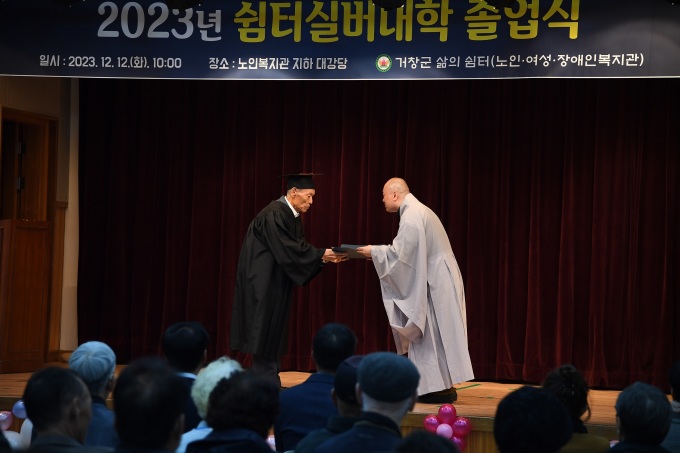 | 선용스님(오른쪽)이 12일 거창군 삶의 쉼터 대강당에서 어르신에게 졸업장을 전달하고 있다.[사진=거창군]2023.12.12 |