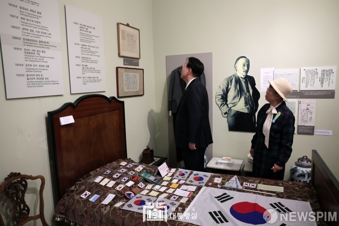 [서울=뉴스핌] 윤석열 대통령이 13일(현지시간) 헤이그의 이준 열사 기념관을 방문, 이준 열사가 숨진 방을 관람하고 있다. [사진=대통령실] 2023.12.14 photo@newspim.com