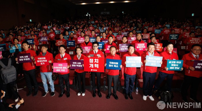 [서울=뉴스핌] 윤창빈 기자 = 한동훈 국민의힘 비상대책위원장 겸 중앙선거대책위원회 총괄선거대책위원장, 윤재옥·나경원·안철수·원희룡 공동선거대책위원장과 후보들이 19일 오전 서울 여의도 국회 의원회관에서 열린 제22대 국회의원선거 국민의힘 중앙선대위 발대식 및 공천자대회에서 피켓을 들고 있다. 2024.03.19 pangbin@newspim.com