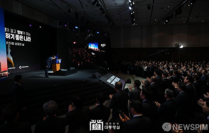 [서울=뉴스핌] 윤석열 대통령이 20일 서울 영등포구 63컨벤션센터에서 열린 제51회 상공의 날 기념식에서 특별강연을 마치고 참석자들에게 인사를 하고 있다. [사진=대통령실] 2024.03.20 photo@newspim.com
