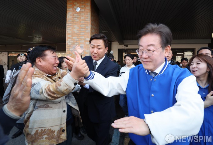 [서울=뉴스핌] 윤창빈 기자 = 더불어민주당 이재명 대표가 24일 서울 서초구 서울고속버스터미널을 방문해 김한나 서초갑 후보, 홍익표 서초을 후보와 함께 시민들에게 인사하고 있다. 2024.03.24 pangbin@newspim.com
