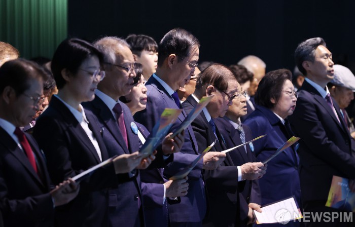 [서울=뉴스핌] 정일구 기자 = 한덕수 국무총리가 11일 오전 서울 서대문구 국립대한민국임시정부기념관에서 열린 제105주년 대한민국 임시정부수립 기념식에서 참석자들과 임시정부 성립축하가를 제창하고 있다. 2024.04.11 mironj19@newspim.com
