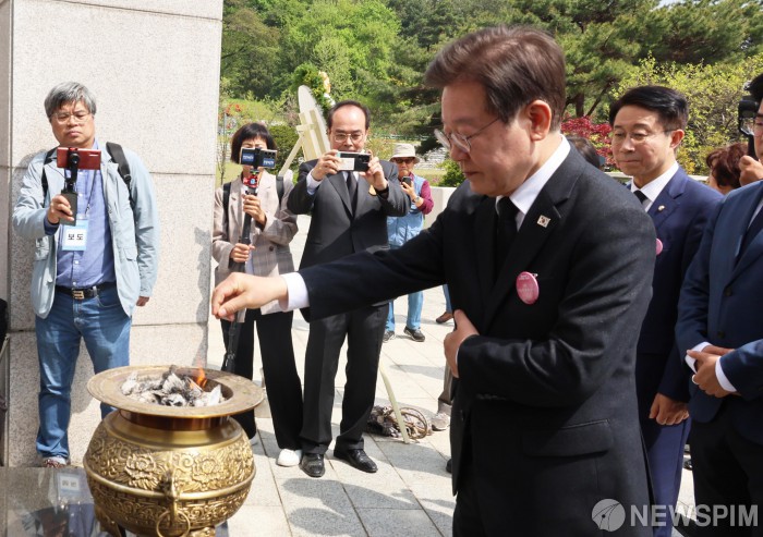 [서울=뉴스핌] 양윤모 기자 = 이재명 더불어민주당대표가 19일 오전 서울 강북구 국립 4·19민주묘지에서열린 제64주년 4·19혁명 기념식에서 분향하고 있다. 2024.04.19 yym58@newspim.com