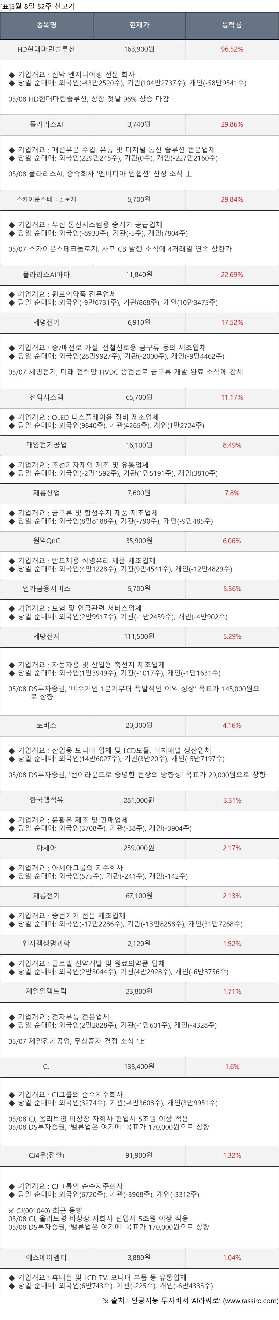 ※ 관련 종목: HD현대마린솔루션, 폴라리스AI, 스카이문스테크놀로지, 폴라리스AI파마, 세명전기, 선익시스템, 대양전기공업, 제룡산업, 원익QnC, 인카금융서비스, 세방전지, 토비스, 한국쉘석유, 아세아, 제룡전기, 엔지켐생명과학, 제일일렉트릭, CJ, CJ4우(전환), 에스에이엠티