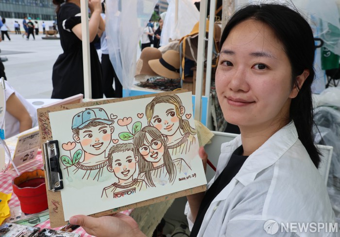 [서울=뉴스핌] 양윤모 기자 = 전국이 무더위와 게릴라 폭우가 계속되는 가운데 29일 오후 비가 그친 서울 광화문광장을 서울 섬머비치 행사장 캐리커쳐 부스에서 작가가 자신의 작품을 보여주고 있다. 2024.07.29 yym58@newspim.com