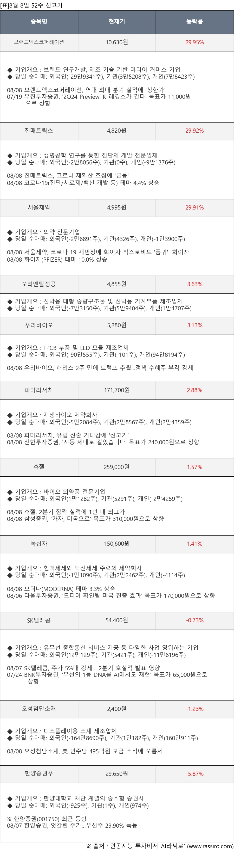 ※ 관련 종목: 브랜드엑스코퍼레이션, 진매트릭스, 서울제약, 오리엔탈정공, 우리바이오, 파마리서치, 휴젤, 녹십자, SK텔레콤, 오성첨단소재, 한양증권우