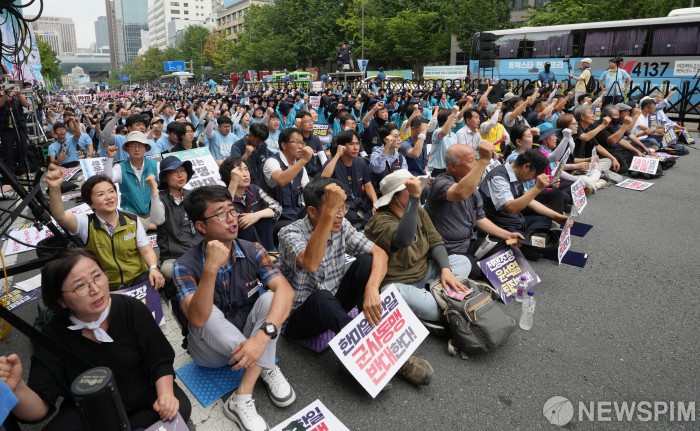 [서울=뉴스핌] 최지환 기자 = 10일 오후 서울 중구 세종대로에서 열린 8.15 범국민대회에서 집회 참가자들이 구호를 외치고 있다. 2024.08.10 choipix16@newspim.com