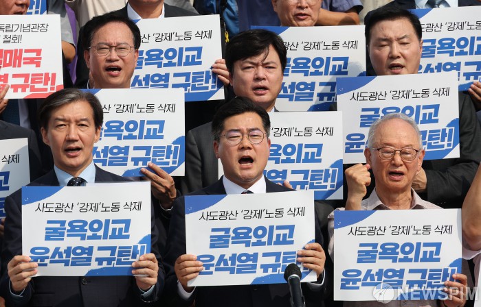 [서울=뉴스핌] 이형석 기자 = 박찬대 더불어민주당 대표 직무대행 겸 원내대표와 조국 조국혁신당 대표를 비롯한 참석자들이 14일 오전 서울 여의도 국회 본청 앞 계단에서 열린 '8.15 광복 79년, 윤석열 정권 굴욕 외교 규탄! 국회-시민사회 1000인 선언 기자 회견'에서 구호를 외치고 있다. 2024.08.14 leehs@newspim.com