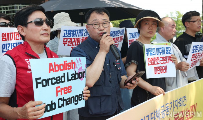 [서울=뉴스핌] 이호형 기자 = 함재규 민주노총 부위원장이 14일 서울 용산구 전쟁기념관 앞에서 열린 전국민주노동조합총연맹,전국이주노동인권단체의 노동자 인권과 노동권 보장 촉구 공동 기자회견서 발언을 하고 있다. 2024.08.14 leemario@newspim.com