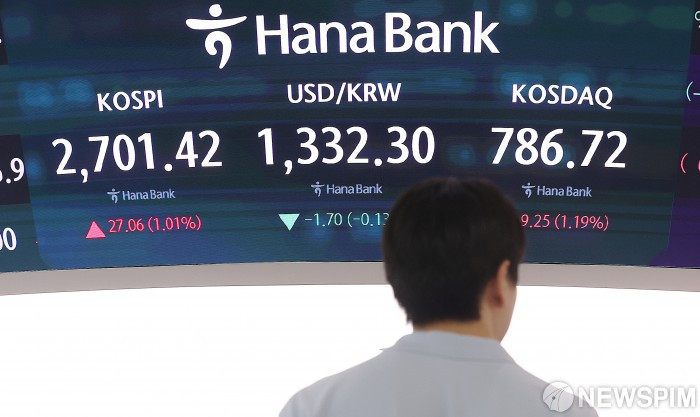 [서울=뉴스핌] 정일구 기자 = 20일 코스피 지수가 전 거래일보다 25.38포인트(0.95%) 상승한 2699.74에 출발했다. 코스닥 지수는 전 거래일대비 6.26포인트(0.81%) 오른 783.73에 시작했다. 달러/원 환율은 전 거래일보다 3.0원 내린 1331.8원에 장을 열었다. 이날 오전 서울 중구 하나은행 딜링룸에서 딜러들이 업무를 보고 있다. 2024.08.20 mironj19@newspim.com