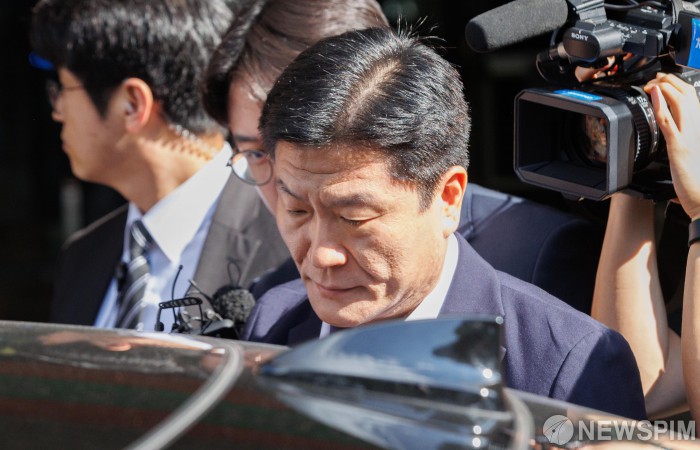 [서울=뉴스핌] 윤창빈 기자 = 10.29 이태원 참사 당시 부실 대응으로 참사 피해를 키운 혐의 등으로 기소된 이임재 전 용산경찰서장이 30일 오후 서울 마포구 서울서부지방법원에서 열린 1심 선고공판에서 금고 3년형을 선고받고 나서고 있다. 2024.09.30 pangbin@newspim.com