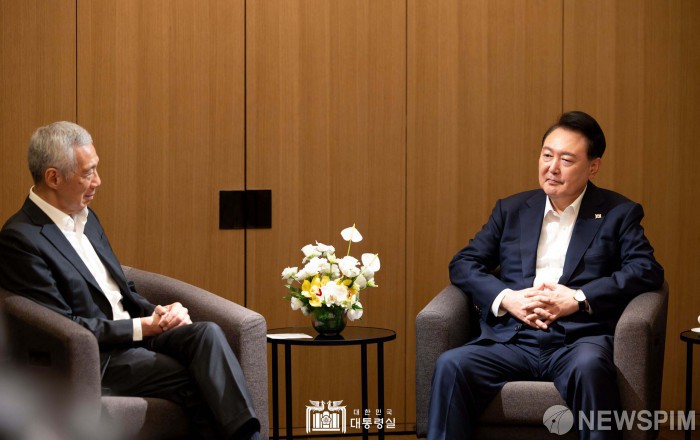 [서울=뉴스핌]윤석열 대통령이 8일(현지시간) 싱가포르 한 호텔에서 싱가포르 전 총리인 리셴룽 선임장관을 접견하고 있다. [사진=대통령실 ] 2024.10.08 photo@newspim.com