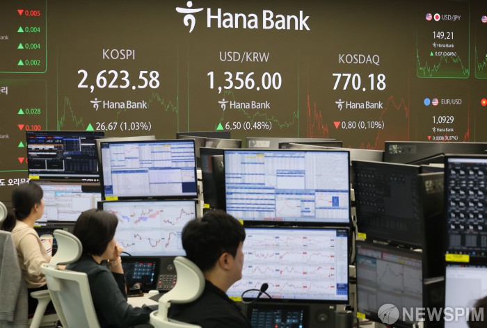[서울=뉴스핌] 양윤모 기자 = 기관이 3,300억 원 넘게 순매수하는 가운데, 14일 오후 3시 30분 코스피지수가 전 거래일 종가보다 26.38포인트(1.02%) 상승한 2,623.29으로, 코스닥지수는 0.72포인트(-0.09%) 하락한 770.26으로 오후 거래를 마감했다. 서울 외환시장에서 달러/원 환율은 전 거래일보다 6.10원(0.45%) 상승한 1,355.60원에 오후 거래를 마감한 가운데, 서울 중구 하나은행 딜링룸에서 직원들이 업무를 보고 있다. 2024.10.14 yym58@newspim.com