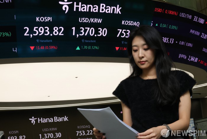 [서울=뉴스핌] 양윤모 기자 = 외국인들의 매도 물량 속 18일 오후 3시 30분 코스피 지수는 전일 종가보다 15.48포인트(-0.59%) 하락한 2,593.82로, 코스닥 지수는 11.84포인트(-1.55%) 하락한 753.22로 금요일 오후 거래를 마감했다. 서울 외환시장에서 달러/원 환율은 전일보다 1.30원(0.09%) 상승한 1,368.80원에 오후 거래를 마감한 가운데, 서울 중구 하나은행 딜링룸에서 직원들이 업무를 보고 있다. 2024.10.18 yym58@newspim.com