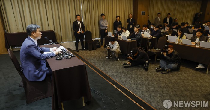 [서울=뉴스핌] 최지환 기자 = 박기덕 고려아연 사장이 22일 오전 서울 중구 코리아나 호텔에서 열린 자사주 취득금지 2차 가처분 신청 기각 판결 관련 긴급 기자회견에서 발언하고 있다. 2024.10.22 choipix16@newspim.com