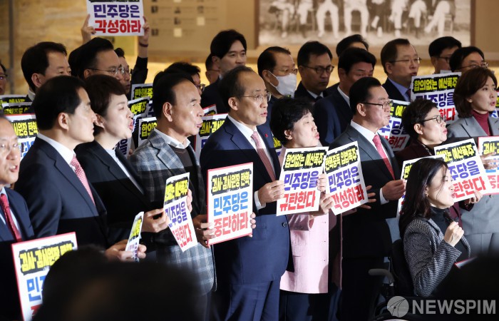 [서울=뉴스핌] 정일구 기자 = 추경호 국민의힘 원내대표를 비롯한 소속 의원들이 1일 오후 서울 여의도 국회 로텐더홀에서 본회의를 앞두고 더불어민주당 규탄대회를 하고 있다. 2024.12.02 mironj19@newspim.com