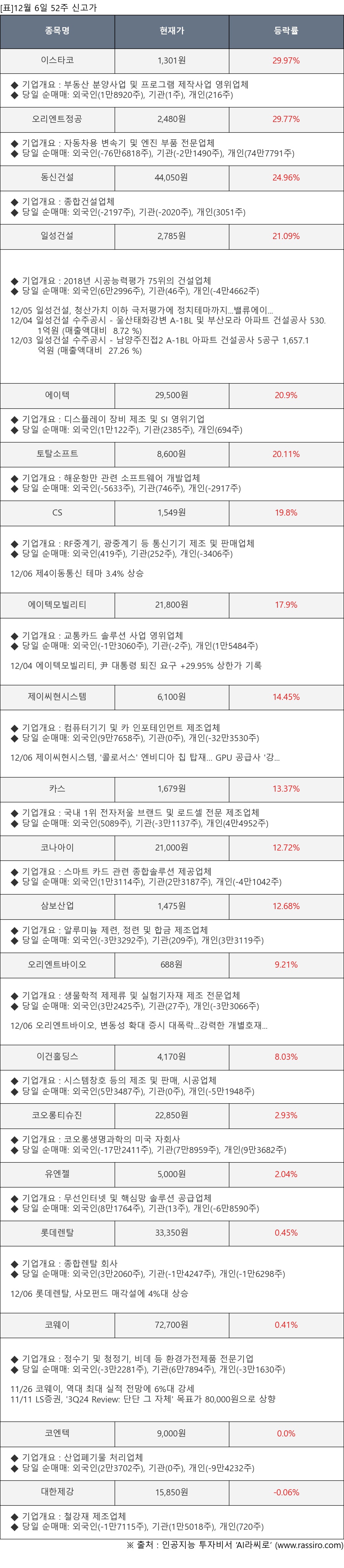 ※ 관련 종목: 이스타코, 오리엔트정공, 동신건설, 일성건설, 에이텍, 토탈소프트, CS, 에이텍모빌리티, 제이씨현시스템, 카스, 코나아이, 삼보산업, 오리엔트바이오, 이건홀딩스, 코오롱티슈진, 유엔젤, 롯데렌탈, 코웨이, 코엔텍, 대한제강