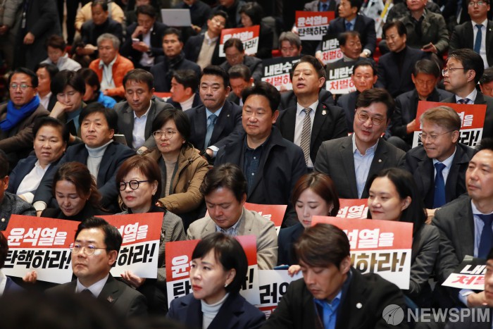 [서울=뉴스핌] 이형석 기자 = 윤석열 대통령이 국회를 방문할 것으로 알려진 6일 오후 야당 의원들이 로텐더홀에서 윤 대통령의 출입을 막기 위해 대기하고 있다. 2024.12.06 leehs@newspim.com