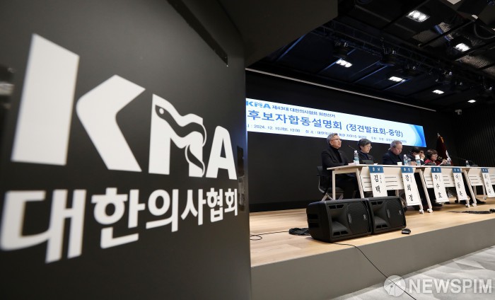 [서울=뉴스핌] 정일구 기자 = 10일 오후 서울 용산구 대한의사협회 대강당에서 열린 제43대 대한의사협회 회장선거 후보자 합동설명회에서 후보자들이 정견발표를 하고 있다. 왼쪽부터 기호 1번 김택우 후보, 2번 강희경 후보, 3번 주수호 후보, 4번 이동욱 후보, 5번 최안나 후보. 2024.12.10 mironj19@newspim.com