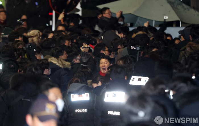 [서울=뉴스핌] 최지환 기자 = 15일 새벽 서울 용산구 대통령 관저 입구에서 이철규 국민의힘 의원을 비롯한 국민의힘 당직자들이 공수처 및 경찰 수사관들이 진입을 막고 있다. 2025.01.15 choipix16@newspim.com