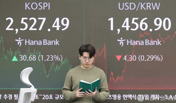 [서울=뉴스핌] 양윤모 기자 = 이창용 한국은행 총재가 “尹 영장 집행으로 경제 프로세스 정상화될 것”라고 밝힌 가운데, 16일 오후 코스피 지수가 전 거래일 종가보다 30.68포인트(1.23%) 오른 2,527.49로, 코스닥 지수는 12.63포인트(1.77%) 오른 724.24로 거래를 마감했다. 서울 외환시장에서 달러/원 환율은 전 거래일보다 4.20원 내린 1,457.00원에 거래되는 가운데, 서울 중구 하나은행 딜링룸에서 직원들이 업무를 보고 있다. 2025.01.16 yym58@newspim.com