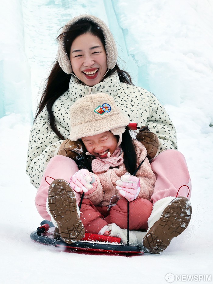 [서울=뉴스핌] 26일 오후 설 연휴속 강원도 평창군 대관령면 송천 일원에서 개막한 '제31회 대관령 눈꽃축제'를 찾은 방문객들이 얼음썰매를 즐기고 있다. 올해로 31회째를 맞는 대관령 눈꽃축제는 내달 2일까지 10일간 열린다. [사진=평창군청] 2025.01.26 yym58@newspim.com