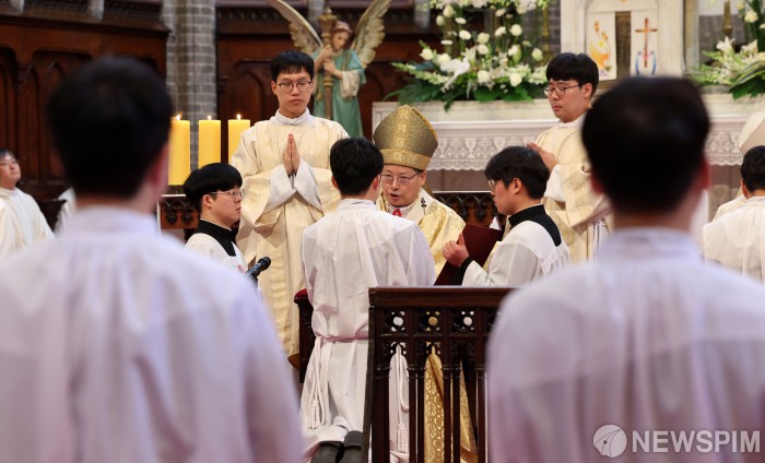 [서울=뉴스핌] 사진공동취재단 = 6일 서울 중구 명동대성당에서 열린 '2025년 천주교 서울대교구 부제 서품식'이 거행되고 있다. 2025.02.06 photo@newspim.com