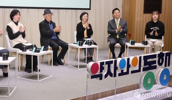 [서울=뉴스핌] 양윤모 기자 = 오세훈 서울시장 10일 오전 시청 3층 대회의실에서 열린 '서울시 약자동행 자치구 지원사업 성과보고회' 토크 콘서트 참석해 박수를 보내고 있다. 서울시는 지난해 자치구에서 추진한 약자동행 지원사업을 평가 마포·양천·노원·동대문·송파·성동구의 6개를 우수 사업으로 선정 했고 마포구의 '함께하는 구강건강 동행관리'를 최우수 사업으로 확정했다. 2025.02.10 yym58@newspim.com