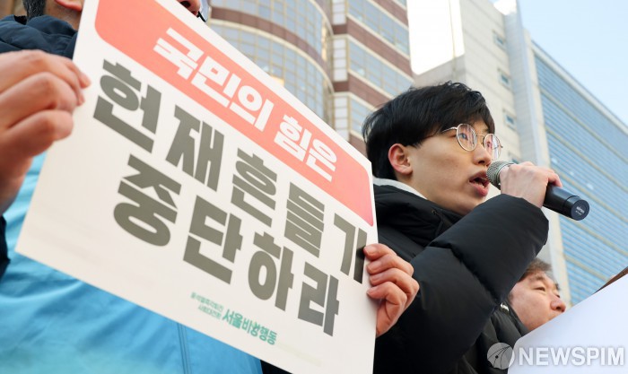 [서울=뉴스핌] 최지환 기자 = 진보단체 회원들이 21일 오후 서울 영등포구 국민의힘 당사 앞에서 내란공범 국민의힘 해체의 날 기자회견을 열고 있다. 2025.02.20 choipix16@newspim.com