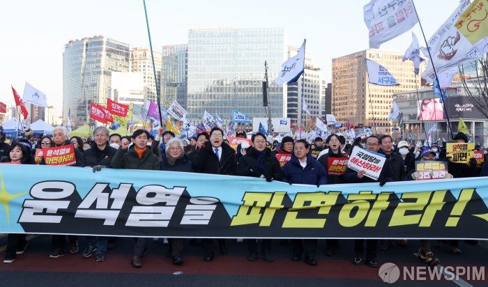 [서울=뉴스핌] 최지환 기자 = 윤석열 탄핵을 찬성하는 진보단체 회원들이 22일 오후 서울 종로구 경복궁 앞에서 '윤석열 즉각 퇴진! 사회대개혁! 12차 범시민 대행진'을 열고 있다. 2025.02.22 choipix16@newspim.com
