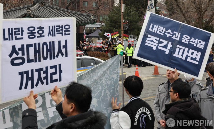 [서울=뉴스핌] 김학선 기자 = 28일 서울 종로구 성균관대학교 앞에서 성대 재학생과 동문들이 탄핵찬성 집회를 하는 가운데 그 옆에서 윤 대통령 지지자들이 탄핵반대 집회를 하고 있다. 2025.02.28 yooksa@newspim.com
