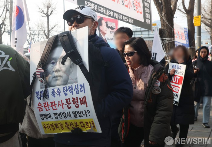 [서울=뉴스핌] 이호형 기자 = 윤석열 대통령 지지자들이 7일 오후 서울 종로구 헌법재판소 정문 건너편에서 문형배 헌법재판소장 권한대행 및 재판관의 퇴근길을 앞두고 시위를 하고 있다. 2025.03.07 leemario@newspim.com