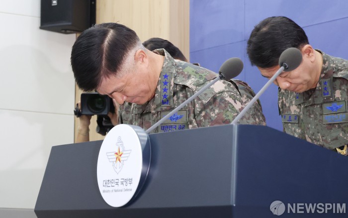 [서울=뉴스핌] 정일구 기자 = 이영수 공군참모총장이 10일 오전 서울 용산구 국방부에서 열린 KF-16 오폭 사고 조사결과 중간발표 브리핑에서 고개 숙여 사과하고 있다. 2025.03.10 mironj19@newspim.com