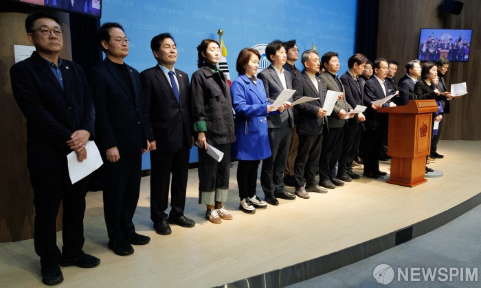 [서울=뉴스핌] 윤창빈 기자 = 더불어민주당 재선의원들이 12일 오전 서울 여의도 국회에서 헌법재판소 선고 촉구 기자회견을 하고 있다. 2025.03.12 pangbin@newspim.com