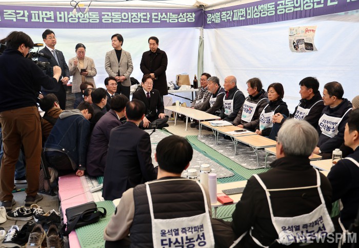 [서울=뉴스핌] 이길동 기자 =더불어민주당 이재명 대표가 21일 경복궁 앞 비상행동 공동의장단 단식농성장을 찾아 발언하고 있다. 2025.03.21 gdlee@newspim.com