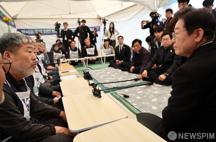 [서울=뉴스핌] 이길동 기자 =더불어민주당 이재명 대표가 21일 경복궁 앞 비상행동 공동의장단 단식농성장을 찾아 김동명 한국노총 위원장의 발언을 듣고 있다. 2025.03.21 gdlee@newspim.com