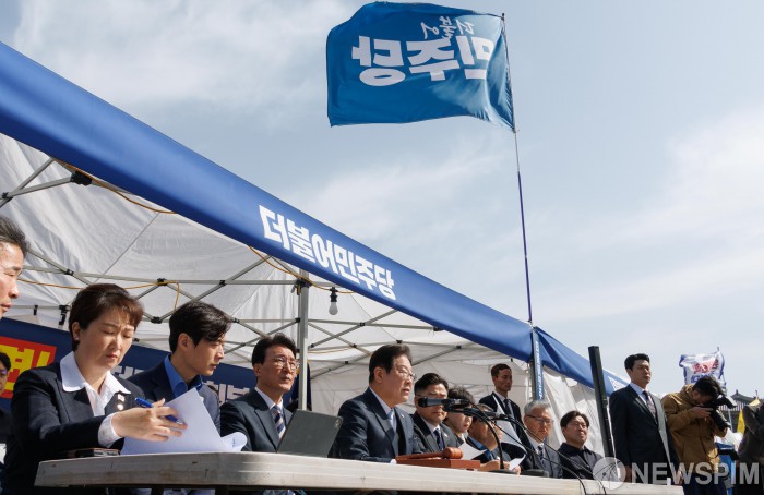 [서울=뉴스핌] 윤창빈 기자 = 이재명 더불어민주당 대표가 26일 오전 서울 종로구 광화문 앞 더불어민주당 천막당사에서 열린 최고위원회의에서 모두발언을 하고 있다. 2025.03.26 pangbin@newspim.com