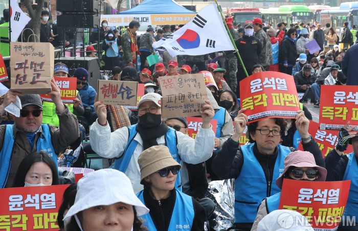 [서울=뉴스핌] 양윤모 기자 = 4일 윤석열 대통령의 정치적 운명이 결정되는 가운데, 촛불행동이 오전 한남동 대통령 관저 앞에서 헌법재판소의 '윤석열 파면 선고 생중계' 집회를 하고 있다. 2025.04.04 yym58@newspim.com