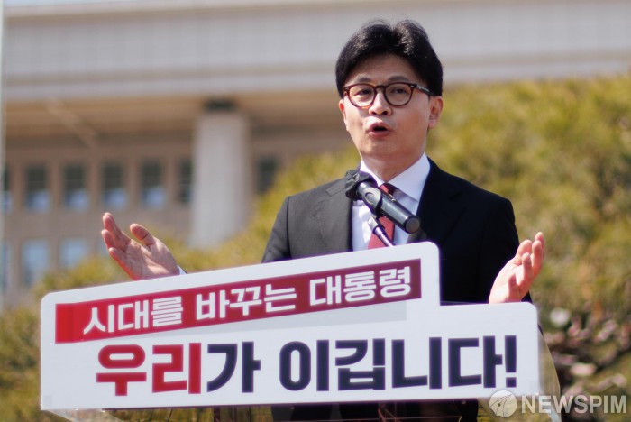 [서울=뉴스핌] 윤창빈 기자 = 한동훈 전 국민의힘 대표가 10일 오후 서울 여의도 국회 분수대 앞에서 제21대 대통령 선거 출마 선언을 하고 있다. 2025.04.10 pangbin@newspim.com