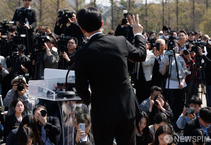 [서울=뉴스핌] 윤창빈 기자 = 한동훈 전 국민의힘 대표가 10일 오후 서울 여의도 국회 분수대 앞에서 제21대 대통령 선거 출마 선언을 하고 있다. 2025.04.10 pangbin@newspim.com