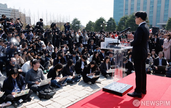 [서울=뉴스핌] 윤창빈 기자 = 한동훈 전 국민의힘 대표가 10일 오후 서울 여의도 국회 분수대 앞에서 제21대 대통령 선거 출마 선언을 하고 있다. 2025.04.10 pangbin@newspim.com