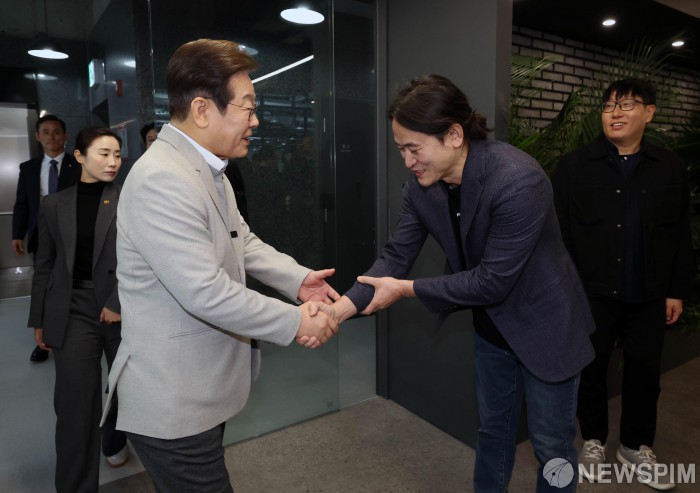 [서울=뉴스핌] 국회사진취재단 = 이재명 더불어민주당 대선 예비후보가 14일 서울 강남구 퓨리오사AI를 찾아 백준호 대표와 인사하고 있다. 2025.04.14 photo@newspim.com